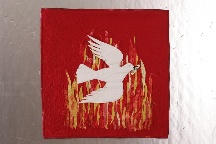Marlette0613 Dove of Peace - This quilt illustrates that peace without war should be the goal of all leaders in the world. Artist's hand dyed and commercial cotton. Thermolam batting. Machine quilted and embroidered on DM.