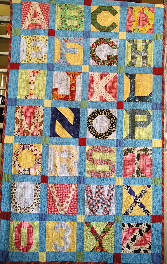 balex33 Duncan's Alphabet Quilt - This was my grandson's quilt for his first Big Boy Bed. I wanted to find material printed with objects that began with alphabet letters (carrots to make the "C" letter, for example). Some were easy to find; some were hard, and some that you would think would have been difficult to find, weren't. The black lab dog is his dog Zack. That made "Z" easy, as you can see! The brown lab dog is his dog Maggie ("M") You will never guess what the most difficult material to find was, so I'll tell you! It was material to make the letter "I"!!! Who knew?????? Finally found ice cream. You'd have thought there'd be an iguana on material, wouldn't you? He was very excited to get this and sleeps under it every night. Problem is: I told him when he learned the alphabet, I'd make him a new quilt! He's in first grade now, so I'm in trouble.