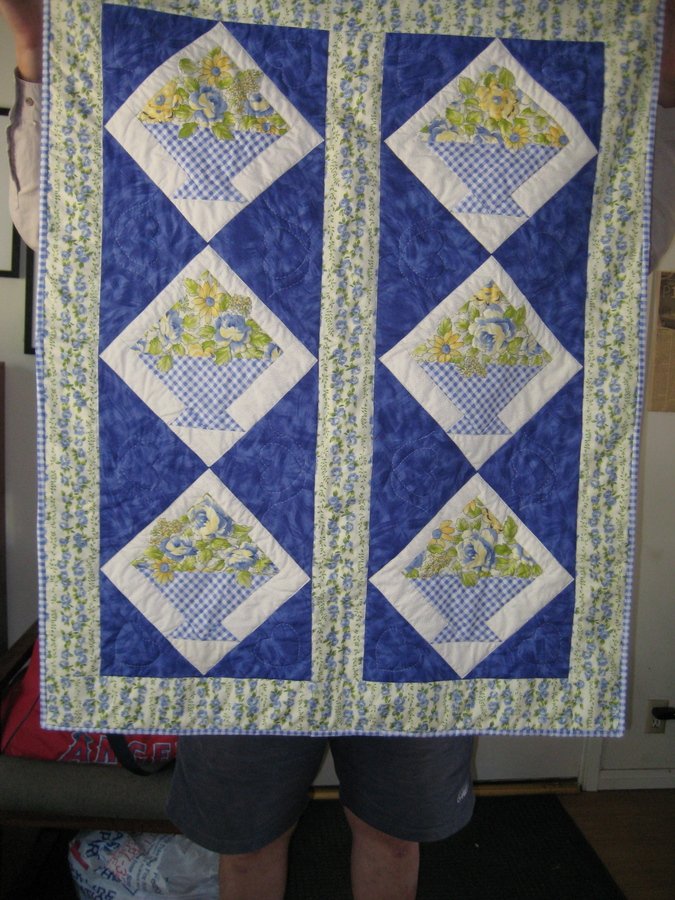 | Design Source - Description | Flower Baskets, set on points. Some flowers are appliqued. Corner triangles, striped lattice border |