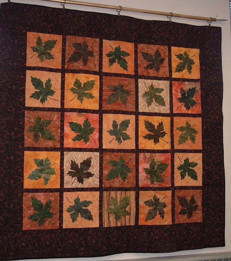 | Design Source - Description | Rich autumn batiks form colour behind green batik trapunto leaves. Machine stitched stems. |