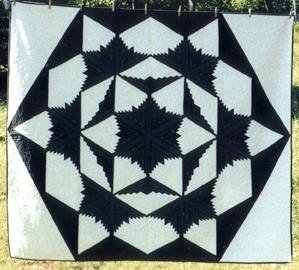 | Design Source - Description | Forest greens and white tone-on-tone used in diamond log cabin blocks to form kaleidoscope. |