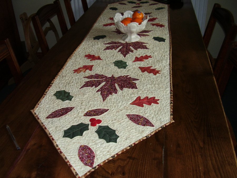 mustquilt autumn leaves - This is a table runner i have recently made. The leaves were taken from the original leaves that i collected last autumn on a walk with my hubby and our two jack russels. Its machine pieced the applique is machine. The quilting is my first practise piece with my new bernina 630 with the BSR foot, Amazing! I loved all of the work in it.