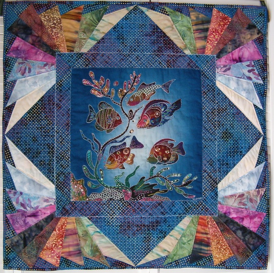 bcneeley Fishing for Compliments - Center panel was purchased at 2006 International Quilt Festival in Houston. Border Panel was also purchased there. Completed quilt is embellished with multiple shapes of beads.