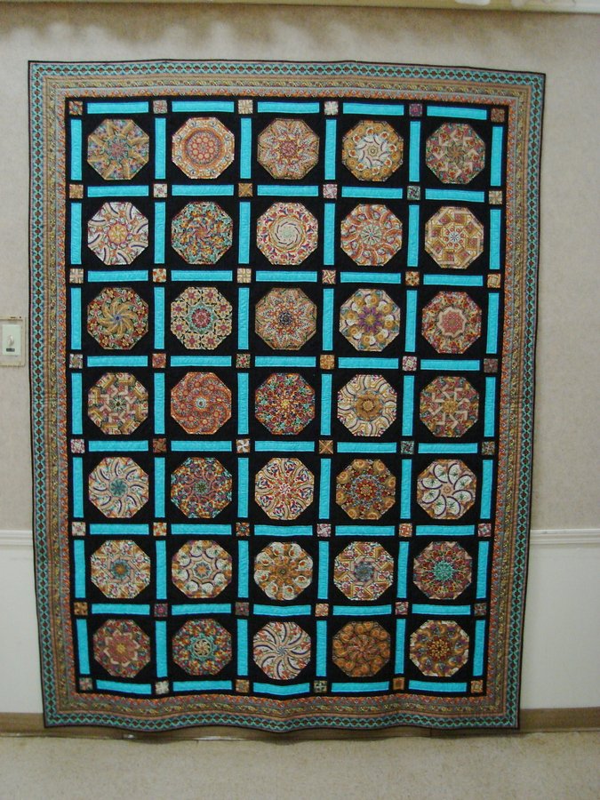 | Design Source - Description | Stack-n-Whack pattern consisting of blocks made of 8 kite shapes plus corner triangles, strip sashing with cornerstones made of 4 triangles in stack-n-whack technique. |