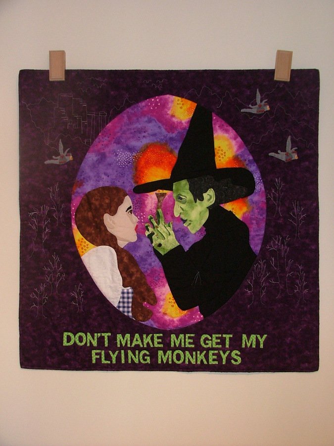 QUILTNBUG Flying Monkeys - My quilt guild had a challenge where you were given a color, a feeling, and an embellishment to use on a quilt. My color was purple, my feeling was anger, and my embellishment was beads. The monkeys jackets have beading on them. I won second prize with this quilt.