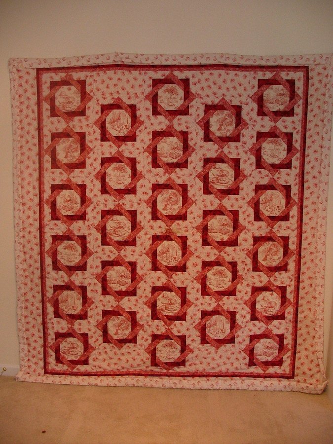 QUILTNBUG Red and White and Violet - I have a very dear friend Violet who has been a quilt mentor to me. She is 89 years old. I saw a quilt she had done with this block and loved it. I had the same fabric she used but I was a little short so she gave me her leftover fabric. This quilt has been completely pieced by hand and is in the process of being hand quilted. I may be 89 by the time I get it finished. (I am 45). I set my blocks a little different from hers. I staggered mine because I thought it looked like picture frames on a wall.