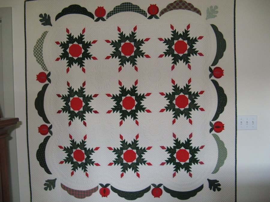 | Design Source - Description | Made as a vehicle for hand quilting, this scrap red and green feathered star has been published three times in magazines and once in a book. |