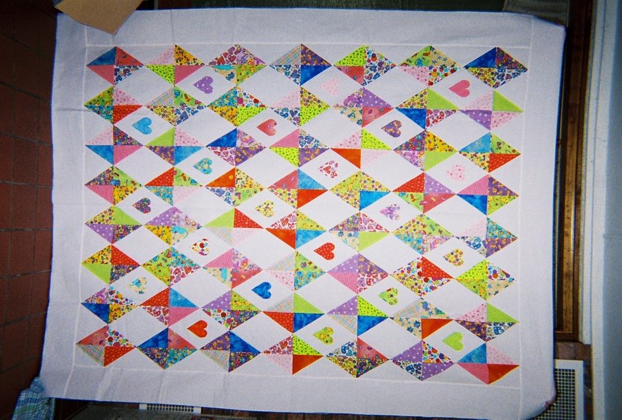 geomauldin Youthful Hubris - I took this class at the local quilt shop - Patchwork Place, Norman Ok. I planned to make this quilt for my niece who is attending Oklahoma State University in the honors program. I made if for her dorm room. The fabric has cats, dogs, hairdryers, flowers, suns, perfume bottles, books, etc. I selected a lot of the fabrics from the children's section of the quilt store. It is bright and wonderful. The teacher taught the class using Aunt Gracie's - which I love - but I wanted something different. So this is bright and beautiful. I'd paper piece again. I also used a fusible to add the hearts in the middle of the diamonds.