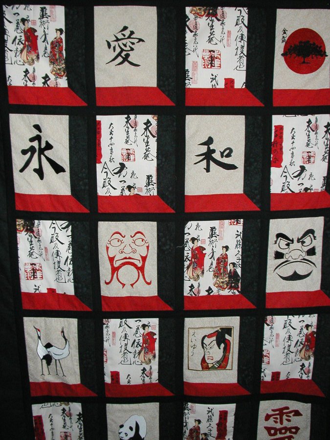 | Design Source - Description | Asian inspired quilt made for my daughter, Erika for Christmas. Some blocks are commercial fabric, alternating blocks are machine embroidery. Striking dimension created by this block. |