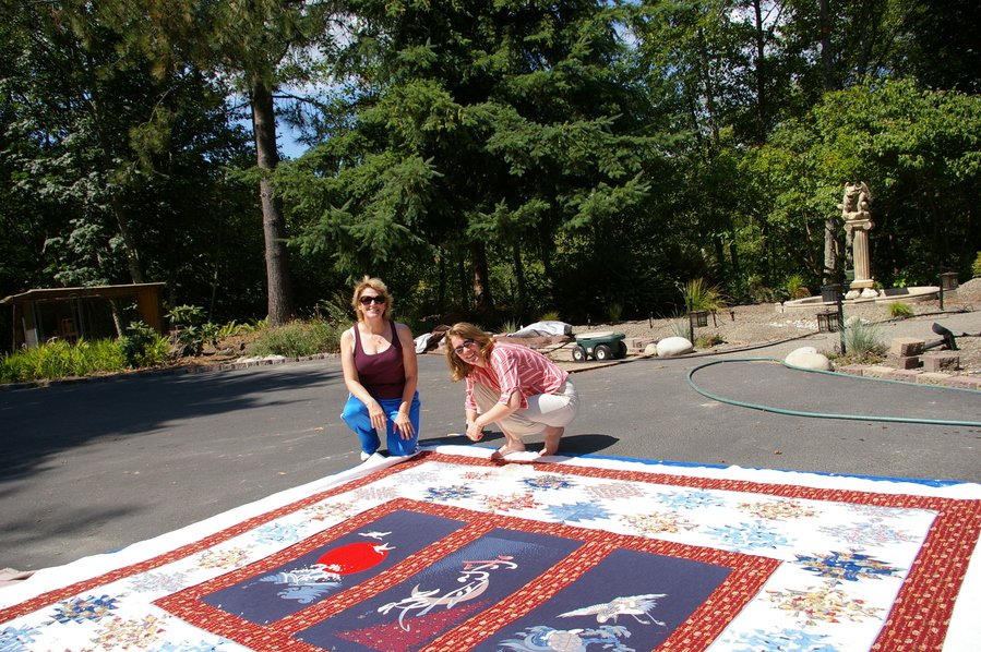 NWNancy Kindra's Lantern - This quilt is still a work in progress. It is so large that we are basting it on a two plastic tarps in my driveway. My daughter and I have been working on it together for over a year.