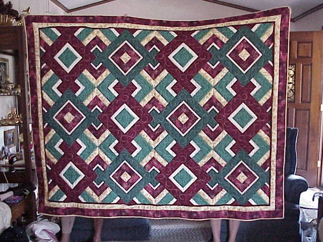 | Design Source - Description | I took a class by Mary Ellen Hopkins and learned this pattern. It is quilted in gold metallic thread which really makes it an elegant quilt. The colors were chosen for my son. |