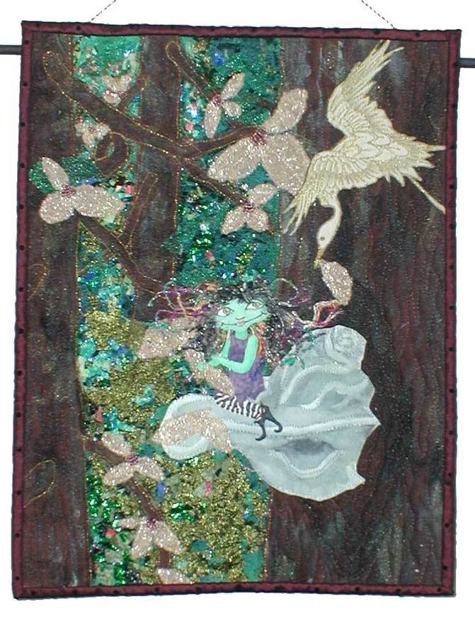 BarbaraZuazua Mushrooms and Elephant Ears - This quilt was inspired by a japanese quilter's technique of shredding fabrics, arranging them as if painting, and then trapping it in place with tule and free motion quilting (I saw this on Simply Quilts- Spring 2006). She used a long arm, I used a home machine. I was testing different fabrics, yarns, beads, paint, applique, and turned lames into confetti.