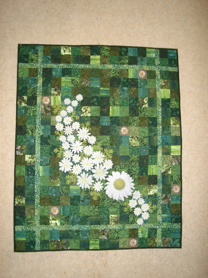 ntrquilter He Loves Me, He Loves Me Not - This wall quilt is made of batiks in greens, plus a few photos of daisies. There are fabric daisies appliqued on, French knots and beads in the centers, with some Tintzl scattered on and tulle over the whole quilt. It is quilted in meandering stitch with clear thread.