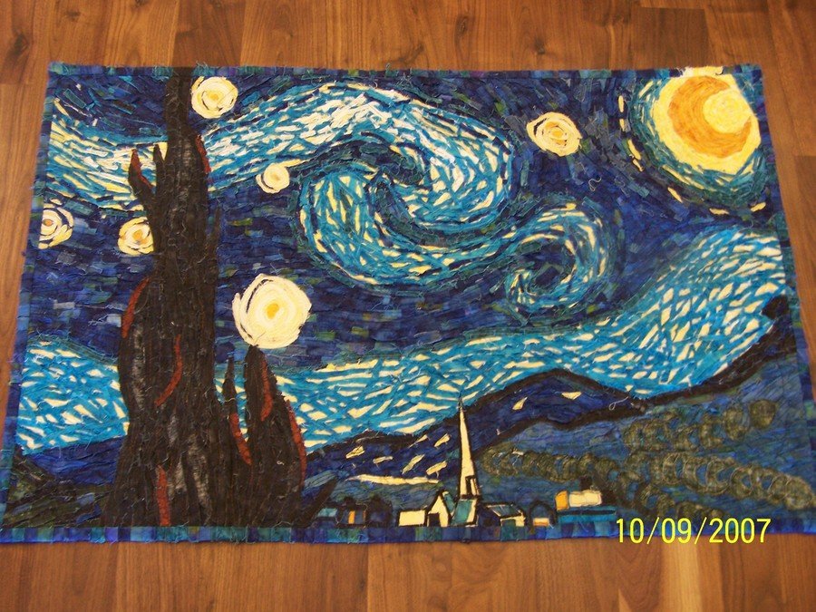 richkayla My Starry Night - I did not glue but would sew individual pieces of this qult together on the background. i used scaps of fabric no longer or wider than a brush stoke. As pieces of fabric puddled at my feet I smiled to think about how Vincent would paint so thick it would puddle on the floor off the canvas. The edges are raw and unraveling like unto Vincents mental state as he painted this famous scene.