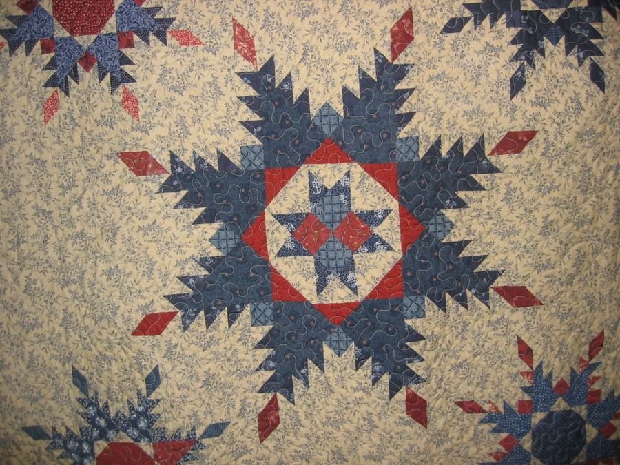 sewhappy10000 Favorite Feathered Star - A combination of large and small feathered star blocks. Made to prove to myself that I could do it. It was a wonderful experience and even though time consuming and a 1/4 inch seam is mandatory--It was a quilt that went together easily. Thank you Marsha McClosky.