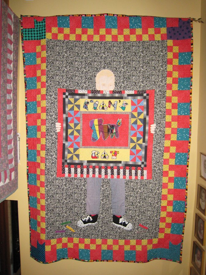 | Design Source - Description | A round robin that started with a kindergarten picture of a cat that Ryan drew. Came back as Ryan holding the picture. Machine quilted. |