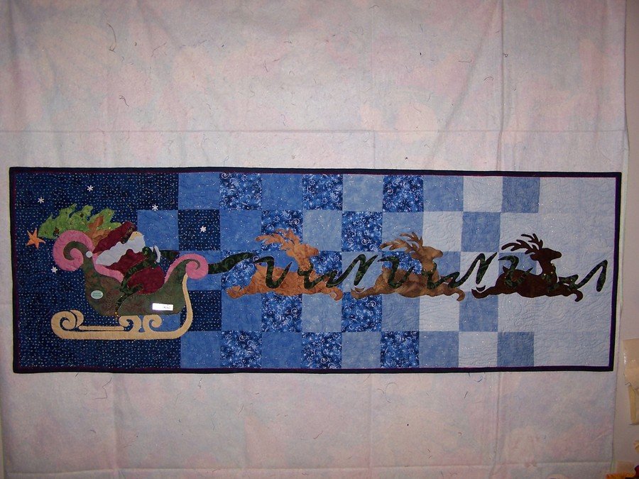 thereadingteacher Santa's Midnight Runner - This is a table runner made of batiks. It has a pieced background and turned applique for the santa, reindeer and sleigh. It has tiny jingle bells, beads and buttons on it. I used a variety of free hand quilting techniques including bobbin work and the use of hologram threads to create an illustion of the snow blowing in the wind as Santa passes in the night sky.