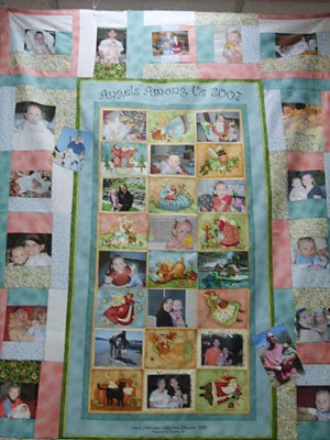TerryCreativeSew Baby JAC - This is the 2007 Nancy Halvorsen Panel. My grandson JAC was born in Nov. 2006. The pictures were coming and there was no place to show them off. The panels were not selling. Each month I put a picture of my grandson in the spot where the month calendar had been. It was wonderful seeing the baby change each month. We got anxious and finished the quilt so it could be hung up next to the Photo Packages. Everyone loves the idea of using the calendar panel. The pictures remind me of my own son as I see them every day when I come to work. His mother may not get this quilt for a long time.