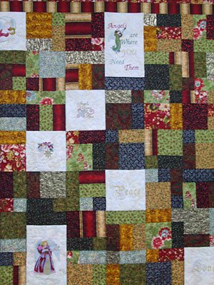 TerryCreativeSew Angels Are Where You Need Them - I had some beautiful angel blocks that I made with my embroidery machines and they lent themselves to an easy quilt. Someone said that I couldn't combine gold, red and silver metallic fabric in a quilt and I said watch me. The angels are embroidered with metallic threads in gold & silver. It was so easy to make the quilt in a few hours. The embroidery took 3 days.