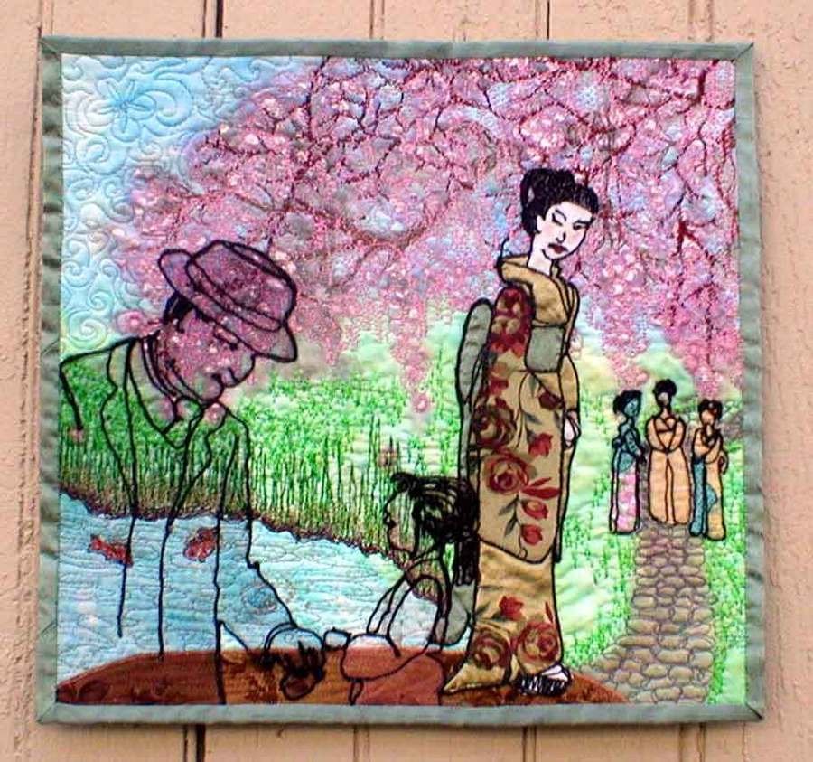 BarbaraZuazua The Very Best and Very Worst Afternoon - I intended to enter the Novel Idea Challenge in Quilting Arts Magazine but didn't finish on time. Months later I dug it out and finally finished it. Anyone who has read "Memiors of a Geisha" will recognize the moment in which this image illustrates. A GREAT read! I read it 4 times! In this small quilt I was beginning to get comfortable with free motion sewing and thread painting. Since the piece is small I was able to breath and relax a bit. I used Jaquard irridescent and dyna-flo dyes on silk for the basis of the thread work. The geishas are all appliques made by bobbin sewing with a slightly metalic black floss, cutting away the fabric edges after sewing. The 'ghost' images of her memory were also bobbin sewn onto tule. I used water soluable stablizer on all applique pieces.