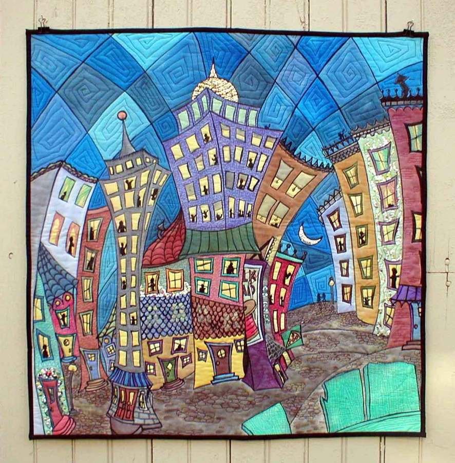 BarbaraZuazua City Walk - This is my first attempt of a whole cloth quilt. I was a painter before quilting so I used my trusty acrylics thinned down. Not very nice for quilting and the color is a bit dull so I've been experamenting. My goal is to make a quilt all about Philadelphia. It's my favorite place to be. The history and the art, the people, the food and the mood are all things I would like to capture. One of my inspirations is the wild mosaics done by a local man using all kinds of broken mirror, glass and ceramic. I believe it all started with a wall on an abandoned lot on South Street in the eighties and expanded to businesses and residences. Not exactly sure of the entire story, just bits of rumor over the years.