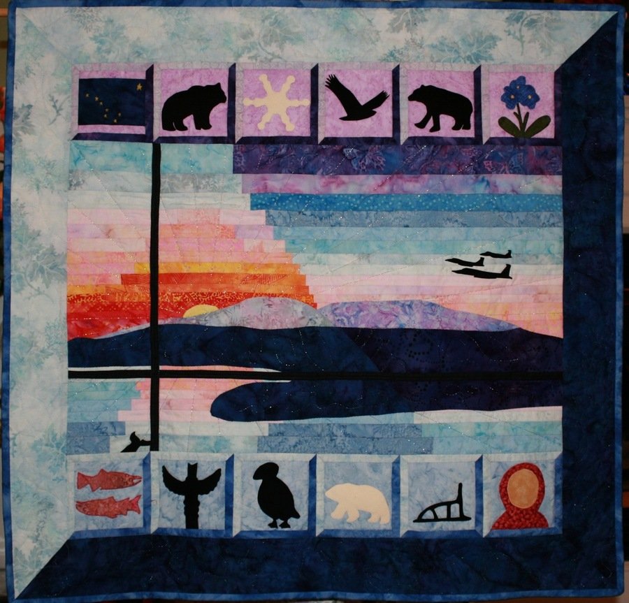 | Design Source - Description | A client asked for a memory quilt of her time in Alaska. She is in the Air Force so wanted the F-15's. She requested both summer and winter sky and an array of uniquely Alaskan "windows". |