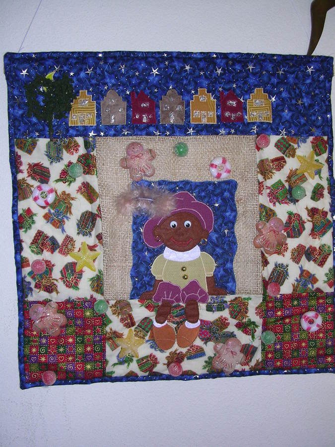 harriette Zwarte Piet (Black Pieter) - I've designed this quilt for a family holyday in the Netherlands thats cauld Sint Nicolaas or in english Saint Nicolaas whe celebrate this feastday on the evening before his birthday for the adaults with something cauld suprisse. You will get a present wrapped up like somting special for you and there is a poem you must read aloud with advice. The childeren leave the shoe with stove or fireplace and when the wake up the next day there will be presents for them brougt by Sint Nicolaas and Zwarte Piet Thats the reason zwarte piet is black because he climbs throwe the chimney