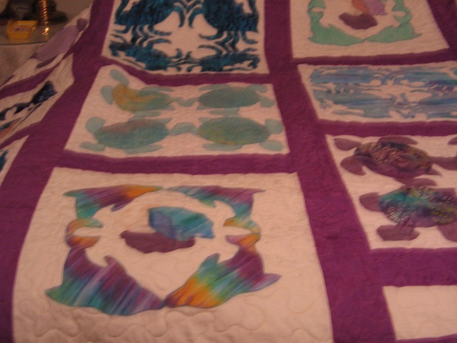 quilthabit Unnamed - Alternating Dolphins, Turtles and Crabs on a king size bed quilt. Used shades of teal, turquoise, and purple for this bedroom overlooking the sound at the beach. Inspiration came from all the turtles that live in the pond near our townhouse!