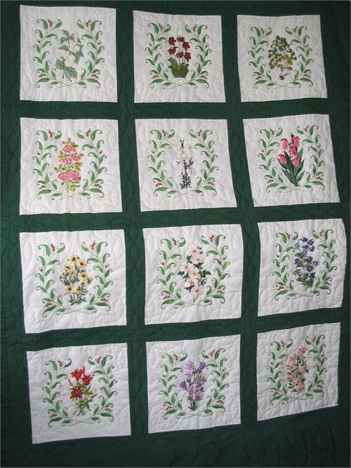 | Design Source - Description | Size: 70" x 82". 100% Cotton.Consists of White 12" blocks with the Canadain Provincial Floral Emblem in each Block. Framed and bordered by green to enhance the floral design. Hand Embroidered and Hand Quilted. |