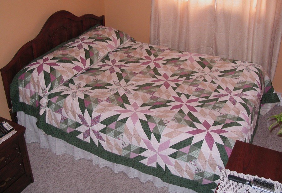 | Design Source - Description | Water Lily Pattern. Size: 88" x 100". 100% Cotton. Machine pieced and quilted. Water Lily comprised of all Half-square triangles sewn together to make a 12" square. Framed by a 5" border. |