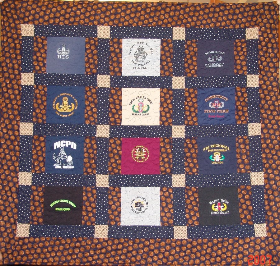 QuiltDivaDi HDS Auction Quilt - An Auction wall hanging to raise money for the Bomb Technicians Memorial Fund. Instructors from the Hazardous Devices School at Redstone Arsenal, Al. donated the slight worn T-shirts for this project. I designed and quilted and donated it for the Auction.