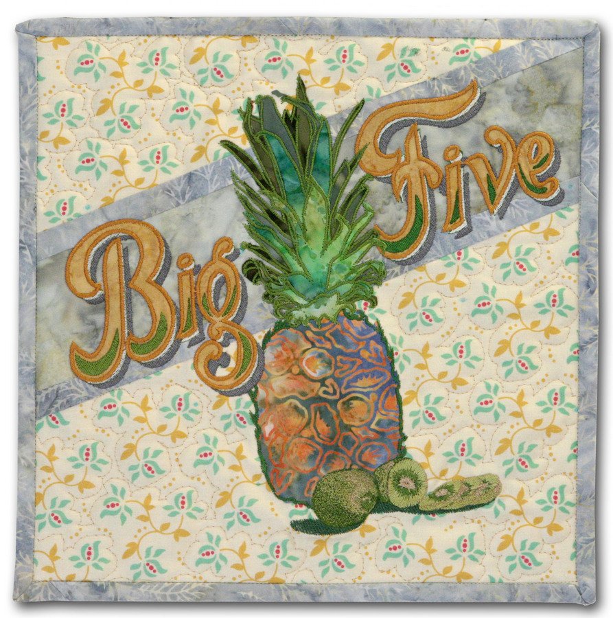 khphillips Big Five Pineapple - This is an original art quilt design and machine embroidered by me. As with all my artwork, it is a complete original. I create all my own embroidery designs from scratch (no stock designs for me thank you). I wanted this quilt to have that fruit crate label type feel to it. It's one in a series of 4 I am doing right now.