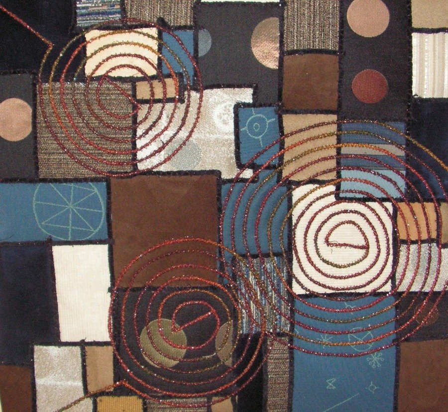 sengler Architexture - This is from a workshop by Carol Taylor sponsored by the Kingwood Area Quilt Guild. Upholstery fabrics are first fused onto a backing. Yarn was then couched over the edges of each rectangle and to quilt the sandwich in a circular pattern.