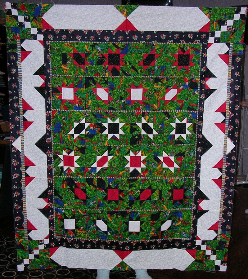 karlpompa Birds in a Blender - The "background" is made up of small squares of a really loud tropical print with toucans, parrots, etc. At some point -- don't hold your breath -- the plan is for snakes or something to be appliqued in the borders; I'm sort of working on a Garden of Eden-type theme, hence the apple-fabric in the borders.
