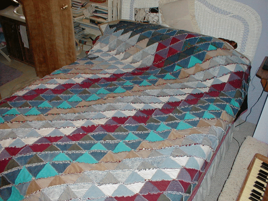 daisystitchr Proverbs 5 - Used old men's pants and denim jeanswith only one pattern piece. The backing was quilting flannel and no batting was used. The pattern was assembled in strips and laid directly on the wrong side of the flannel. Seams were made to show on the front side of the quilt and clipped every 1/4 inch. A simple 1-inch binding finished off the edges. This was a gift to my 20-yr-old grandson.