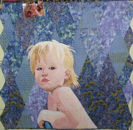mizcontrary my first born - This is my first attempt at making a portrait quilt of a child. It was done from a snapshot of my daughter when she was about 18 months old, after a July 4th family party and she was about to fall asleep on her feet. (The snapshot is attached to the top of the quilt)