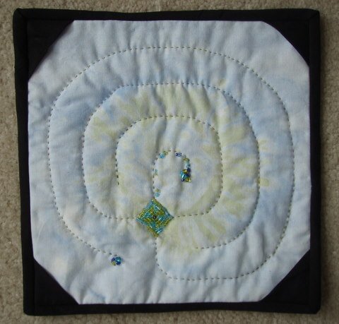 charmquilt Small North Star Labyrinth - This is a double-sided quilt with a classic three-circuit Labyrinth as the quilting design. It is beaded at the entrance, goal, and what I'll call the contemplative spot on both sides. The front (green/blue) has a beaded pattern similar to the North Star quilt block pattern. The fabric was hand painted. It is hand quilted with thick decorative thread using a big stitch method. It is a finger labyrinth and mean to be touched and used.