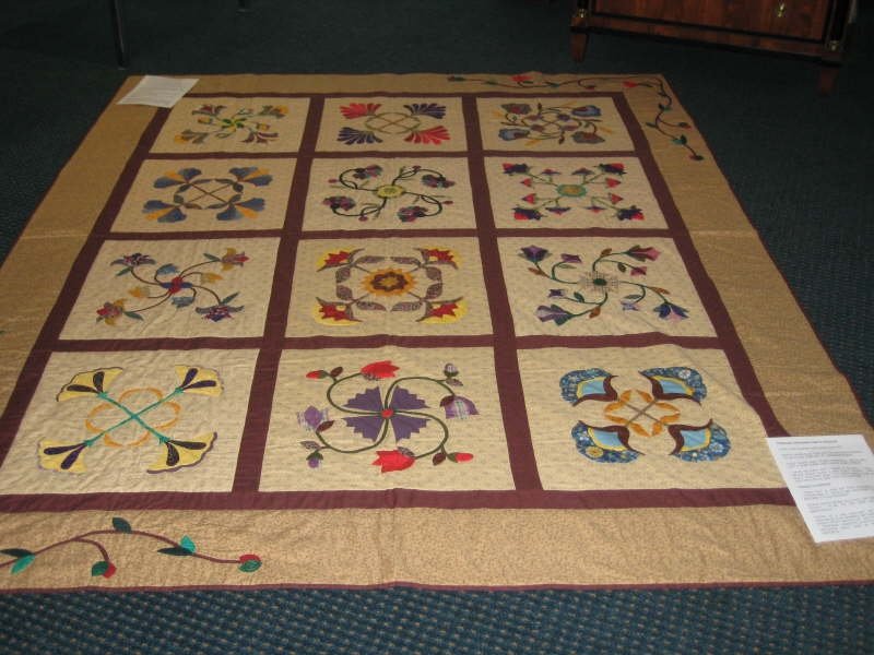 NoggyOne Through Grandmother's Window - 12 years in the making - primarily because I kept leaving it for 2 to 3 years at a time! A lot of hand appliquee and it needs more hand quilting in the borders but after 12 years I had had enough and needed my frame for my next project. I don't know why I made it so big - I would suggest cutting each block smaller and using narrower sashing; and not having such a wide border.