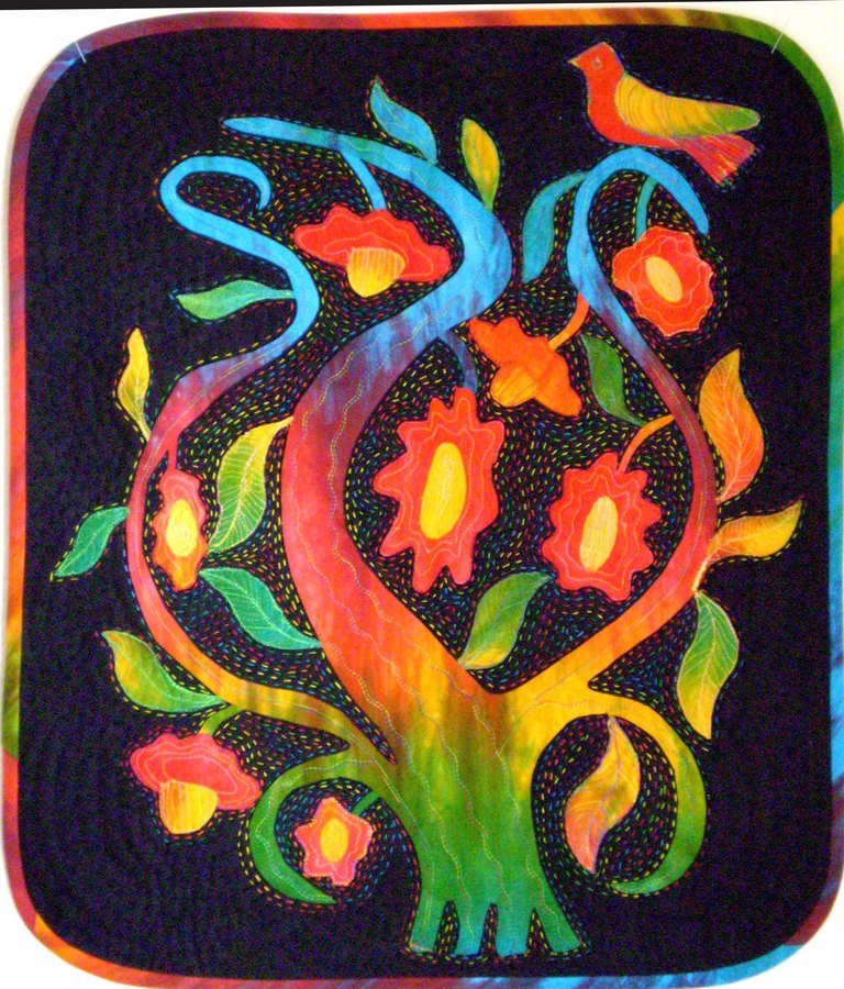 | Design Source - Description | Inspired by a Haitian drum metal sculpture and a piece of Laura Wasilowski's hand dyed fabric, this quilt is fused, machine and hand embroidered and hand quilted. |