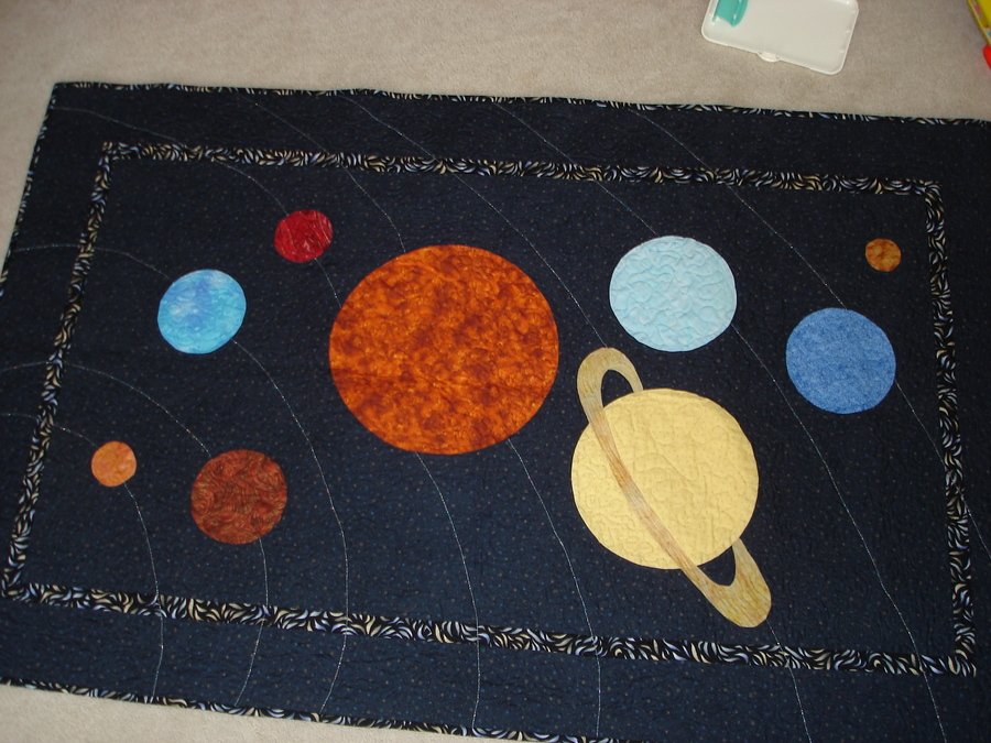 katherinequilts Grammie Loves You as High as the Stars - This quilt was started with a scrap piece of fabric at a technique class using The Circle A Round book by Cheryl Phillips and the Cut around ruler taught by Diane Monde at Aurora Sewing Center in E Aurora NY. I can't bear to waste anything so I quick printed off some pictures of planets and selected the Jupiter fabric from my stash. I did that circle in class and the rest I places and did on my own. The little circles are fused. I used Ricky Tims Sparkling thread for the orbit and left it off of Pluto since this is no longer concidered a planet! This was my first big atttempt at free motion and I did swirls with my daughter, her husband's and my four grandchildren's name hidden in quilt writing. I used a smoke clear thread.