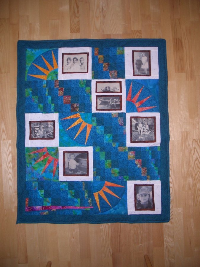 | Design Source - Description | original design in turquoise with black and white family photos of 5 generations, New York Beauty blocks and bargello blocks and lots of batiks and Jinny Beyer palette fabrics |