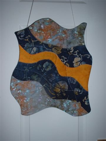 Dragonlady Two sisters challenge - After watching Vikki on the 2nd episode of the Quilt Show my sister and I challenged each other to use her technique of free-hand curves. The brief was to use three or five fabrics and to have it finished before my sister went into hospital to have her hand operated on. As you can see I finished mine - I am still waiting on hers to be completely finished!!!