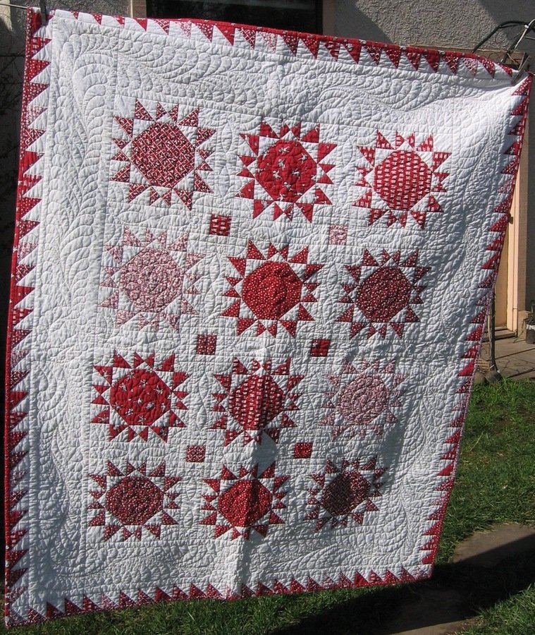 gldcar Good Morning Sunshine - I made this quilt in a class given by Linda BAllard at a retreat in Weaverville CA. I raffled it off at a small quilt retreat with friends and my good friend, Carol Jemison won it. She has it in her house now. It is red and white pieced using 1930's reproduction fabrics. Lots and lots of half square triangles!