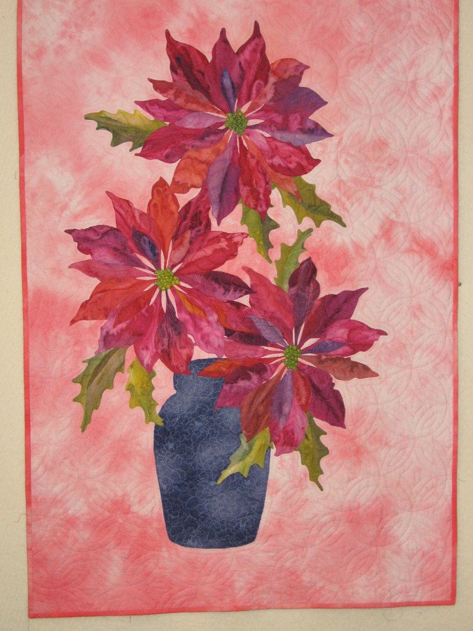 gldcar pointsettias - Pointsettia flowers from hand painted fabrics, raw edged stitched down with decorative threads. Vase is commercial fabric. Background is hand dyed fabric quilted with highlight superior threads. Started in a workshop with Phil Beaver - fabulous class.