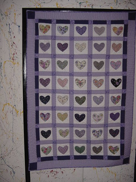 WandaQuilts Hearts & Flowers for Lois - These hearts are simply machine appliqued onto 6" squares. The backing is a solid lavender and the quilter, Gloria Walls disagreed with me on using purple thread. She finally gave in and we were both quite happy with the outcome - the back is as special as the front.