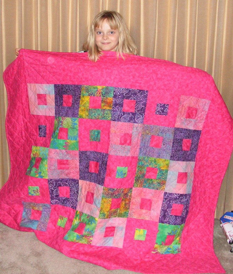 sengler Skyler's First Quilt - This is my 8 year old granddaughter's first quilt. I cut the fabric she chose into 3" strips. We then constructed the blocks log cabin style. It is backed with Minkee. I have high hopes that she will become a quiter or sewer. Her mom will not sew on a button; if a garment needs mending she just puts it on Ebay!