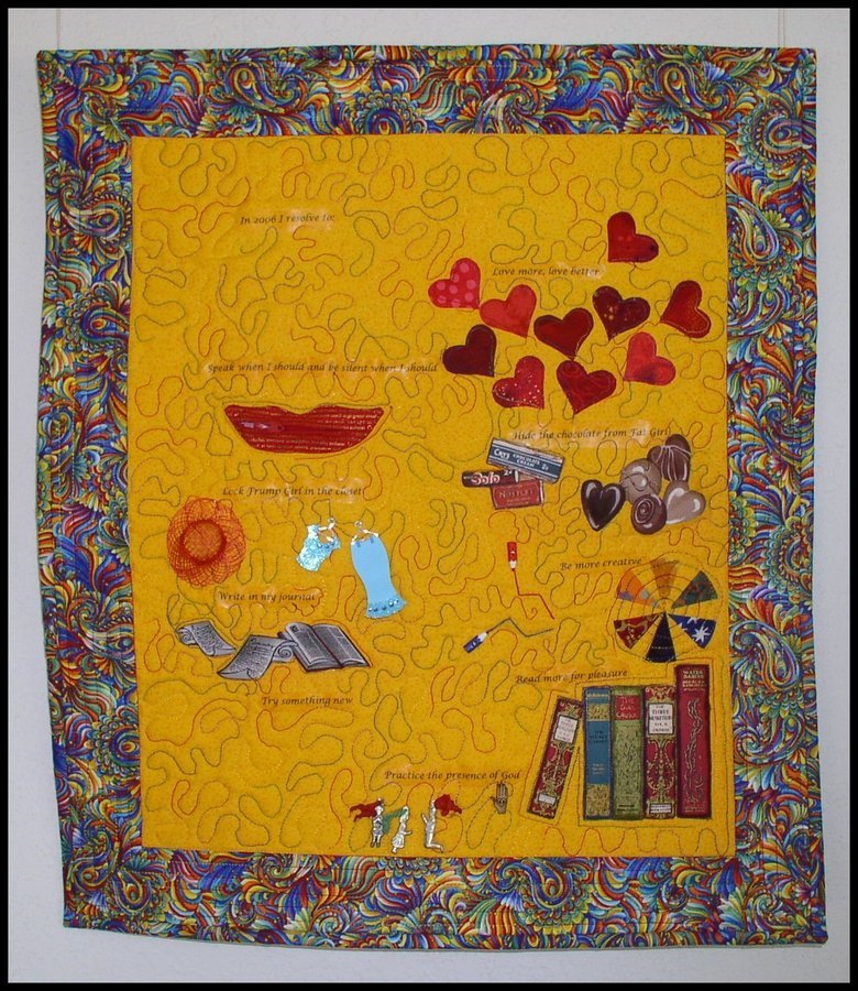 sstephen New Year's Resolutions 2006 - Instead of writing down resolutions for 2006, I made a small wall hanging, including resolutions such as being more creative, locking Frump Girl in the closet, limiting Fat Girl's chocolate consumption, and loving more and better. Although 2006 has come and gone, I still consider this wall hanging to be a work in progress, with more embellishments to come. By the way, I did not keep all my resolutions, especially the one about the chocolate.