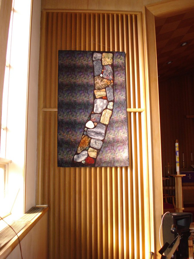Wisewoman Road Less Traveled - This banner was constructed for Lent 2007, reflecting a scriptural series on the Road Less Traveled. It is an original design. The quilting reflects road hazards and includes a snake, a whirlpool, newt, frog and spiders. Plus one lovely Luna moth.