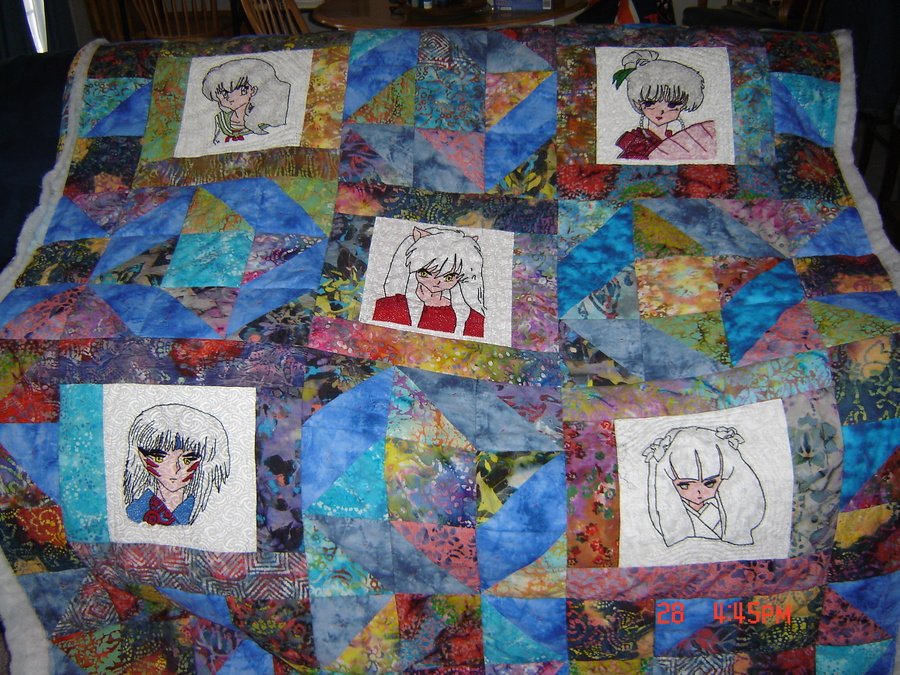 4LoveOfQuilting Kristen's Sweet 16 - This is my second quilt ever made. I used the figures from the Inuyasha cartoon (Kisten's favorite at the time) and made her a quilt for her "sweet 16". I referenced her black and white cartoon books (which figures are quite small). I scanned the cartoon figures, blew them up, mirrored and used a reflection technique to trace them on to fabric. Once traced I used crayon to set the color in the faces before finishing the faces in hand embroidery. Blocks were constructed from 50+ batik fabrics with no similar blocks touching. I was completely self taught at the time so obviously I did all of these steps the hard way including piecing the entire back of the quilt! I made a matching pillow. She currently has this quilt with her at college.