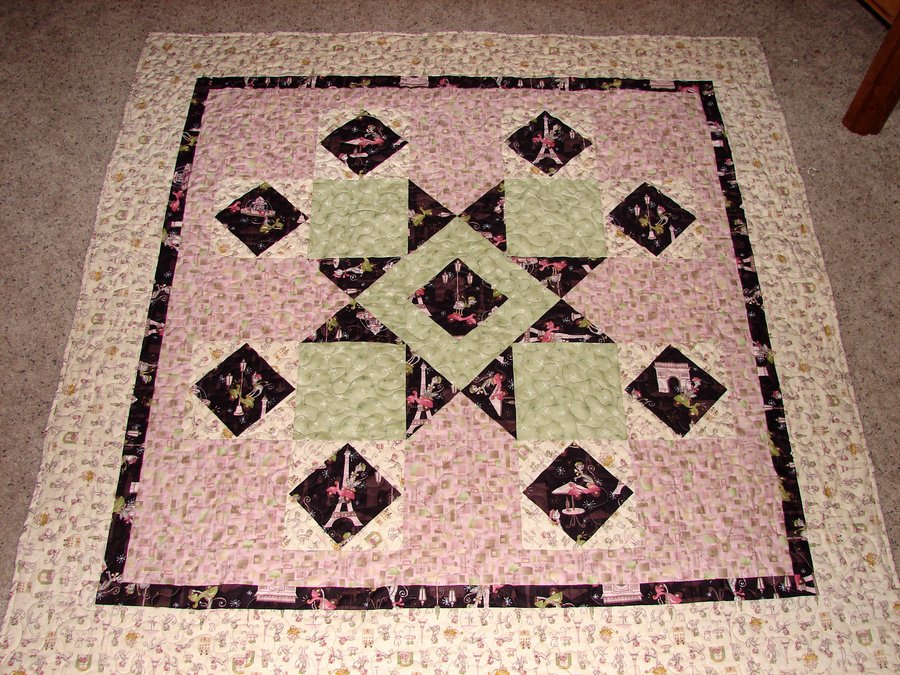 dlbonnett Kitty Sorbet - I was asked to create a small quilt to donate for a closed auction to help the family of a fellow teacher/coach who passed away unexpectedly. I had just added this material to my stash, and decided to 'whip' this up in about 2 weeks. It's not as intricate a quilting job as I would have liked, but don't think anyone will complain. I used a large stippling to quilt it.